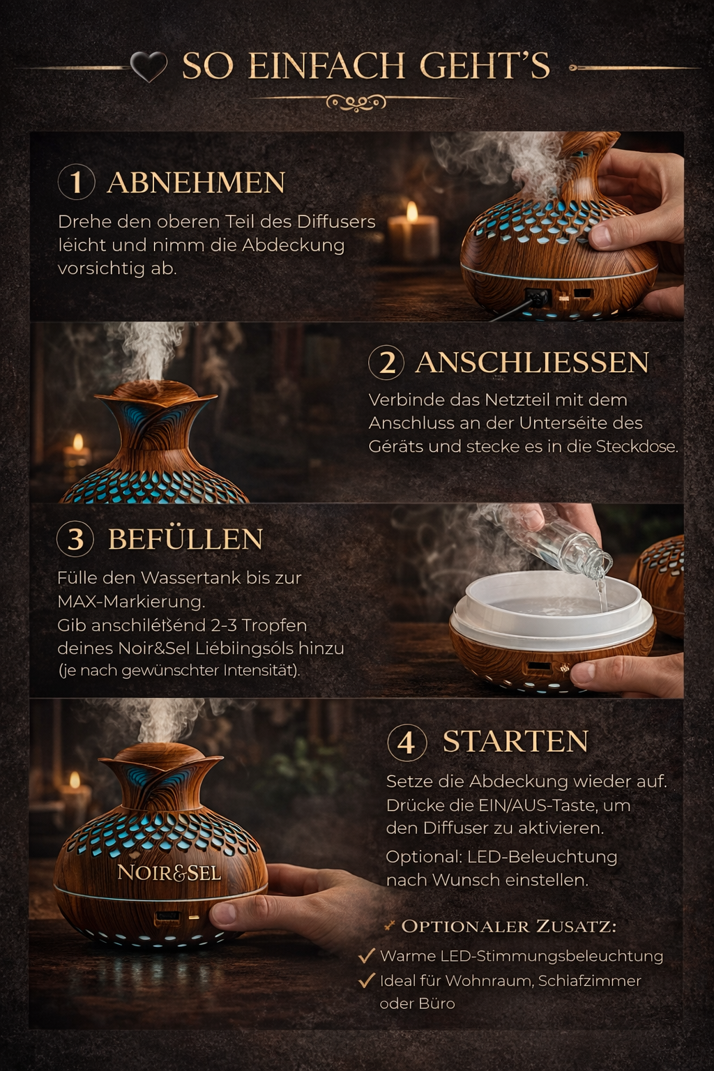 Der Noir&Sel Aroma Diffuser verbindet modernes Design mit ruhiger Eleganz – und verwandelt jeden Raum in eine bewusste Atmosphäre.